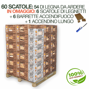 60 scatole: 54 di legna da ardere IN OMAGGIO: 6 scatole di legnetti 6 barrette accendifuoco accendino