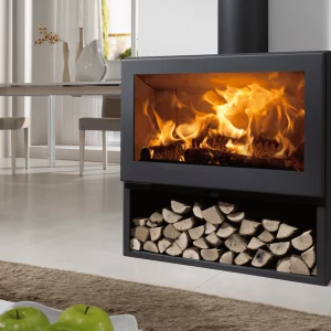 Stufa a legna in stile moderno-contemporaneo e conforme agli standard Ecodesign. Il suo design è ideale per stanze di grandi dimensioni (1000x650x465 mm). Ha un volume di riscaldamento di 380 m3 e una potenza termica di 8,7 KW. Capacità dei tronchi fino a 50 cm. Vista panoramica del fuoco. Ha una presa d’aria esterna e il suo interno è rivestito di vermiculite, che consente un maggiore rendimento.