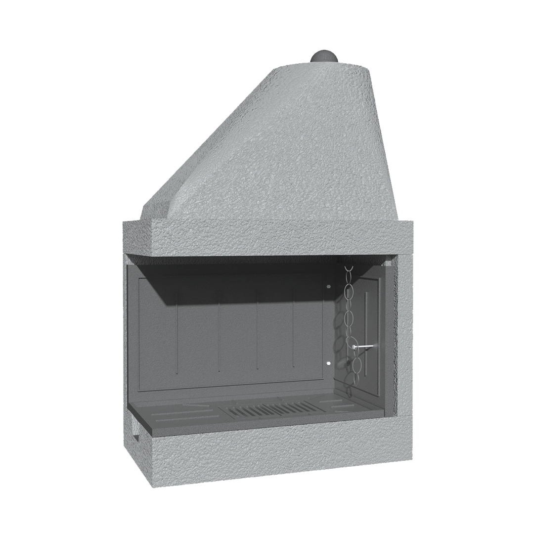Caminetto prefabbricato a legna a focolare aperto completo di: valvola fumi, vaschetta raccogli cenere e griglia in ghisa. Struttura e fiancate realizzate in conglomerato cementizio alleggerito. Focolare realizzato interamente in ghisa (68 kg). Posizionabile sia ad angolo che a parete, adatto per la cottura di cibi ed arrosti. REVERSIBILE In fase di installazione è possibile scegliere se installare il caminetto con apertura destra o sinistra.