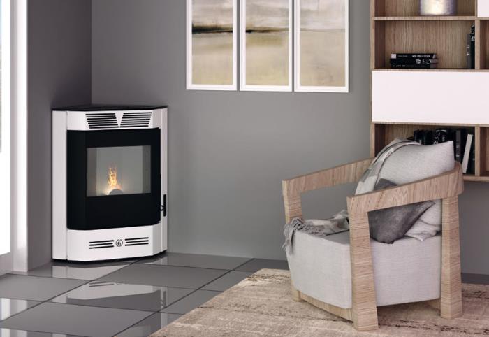 Una nuova concezione e design di stufa a pellet dalle linee arrotondate e dal ridotto ingombro che la rende particolarmente adatta ad essere installata in luoghi dove le normali stufe non riescono a sfruttare appieno le misure dell’angolo e quindi devono sporgere molto di più dal muro.